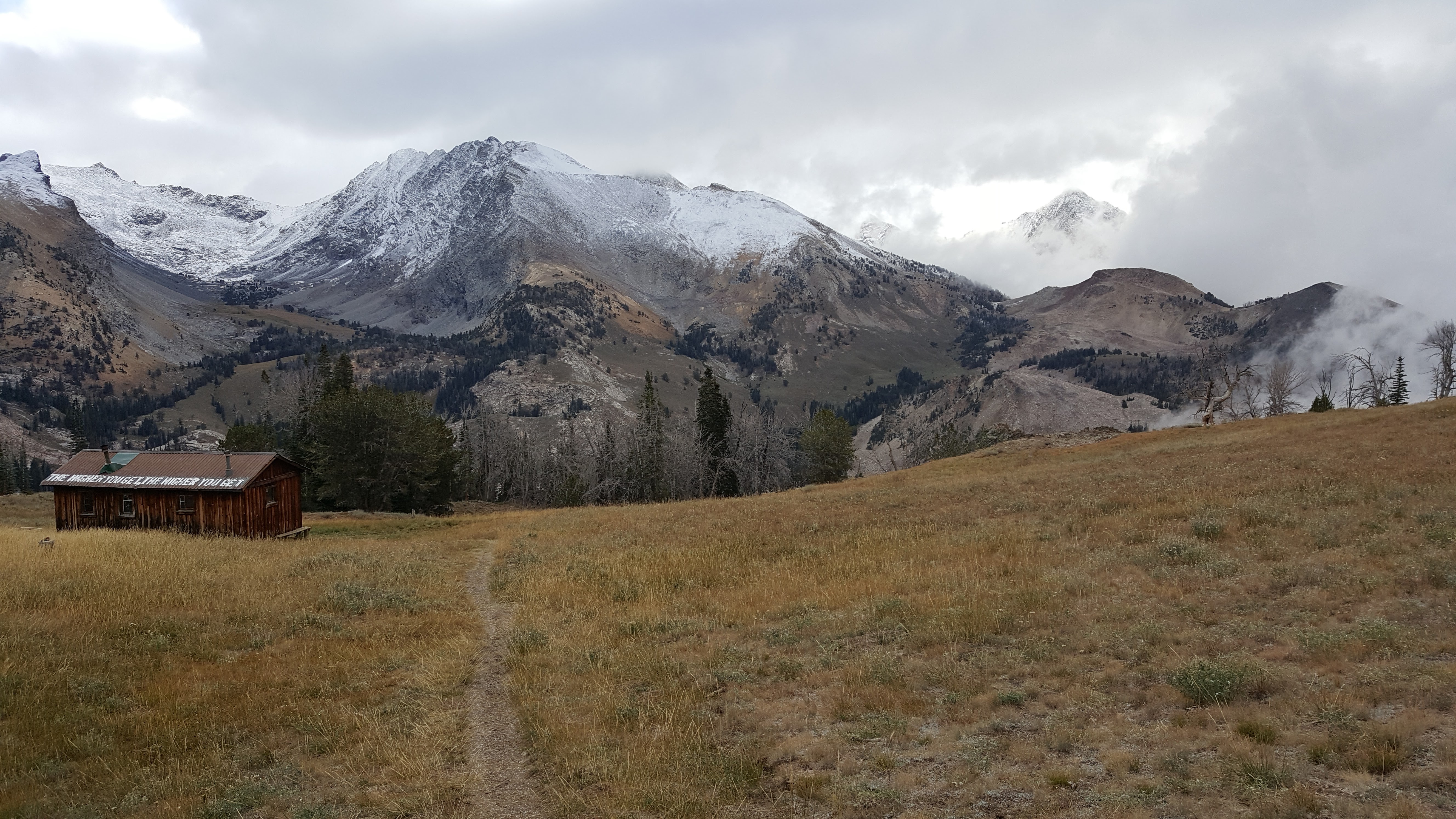 Because of forecasted bad weather and snow, I had decided to cancel the trip I had planned to hike up Hyndman Peak. What I did find close by though was the Pioneer Cabin loop. This looked like a nice hike that would still give me something to do on Saturday in the same general area, over by Ketchum, instead of having to drive another hour or so to get to the Borah area like the other hikes I have done. The loop was between 8 and 9 miles but pretty easy going compared to Borah and Leatherman. The area was really nice as well. I left at about 7:30 and got back to the car 4 hours later, having spent about 20-30 minutes at the cabin. From the cabin you can actually see Hyndman, Old Hyndman, and Cobb even from my pictures with the snow and low clouds. I will have to do that hike again in the summer on a nice clear day when the snow is gone to get some more good pictures. Since I made pretty good time I decided to go to the Hyndman trailhead and maybe go a little ways in just to get some more miles in, possibly stopping around where the snow started. Turns out I almost made it all the way up, stopping short about .3 miles from the top. More info about that on the other page.