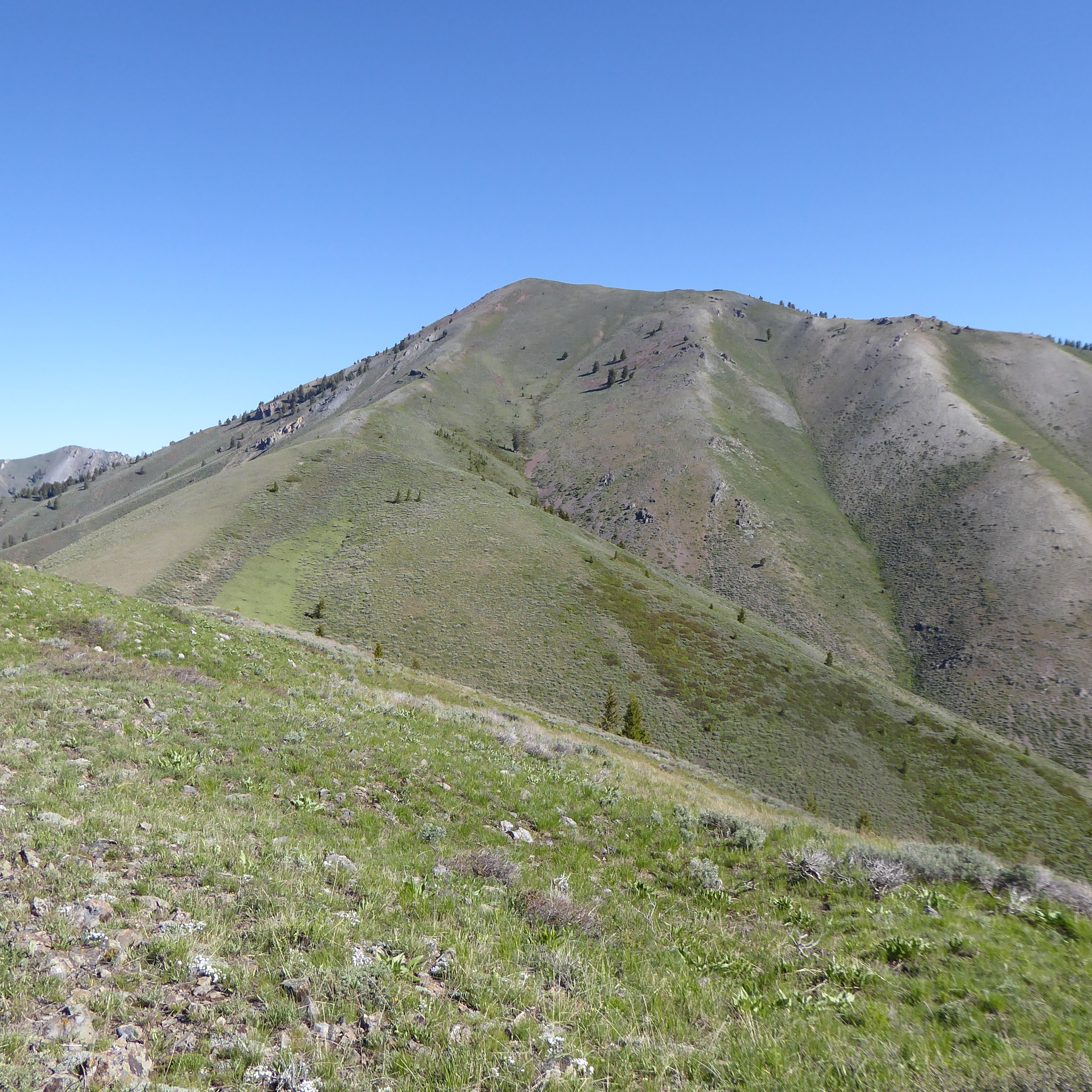 Kelly Mountain is an 8,827 ft peak to the West of Hailey. It's actually very visible in Twin Falls driving down Blue Lakes and I can see it from my kitchen window which was the main reason for wanting to climb it. There is no trail to the peak from any direction, so if you do it, it will be an off-trail bushwhack once you leave the road and start hiking up to the ridgeline or summit. I did the southwest approach from the Kelly Gulch Road. I parked a ways back so that I could make the hike over 5 miles, but you can park closer and go more directly up and down. I don't do many off trail hikes so I can't really compare this to many others. It was fairly tough and steep, but I was expecting that. There were some nice views at the top and the weather wasn't too bad. There are some good camping spots along the road as well which I didn't know about.