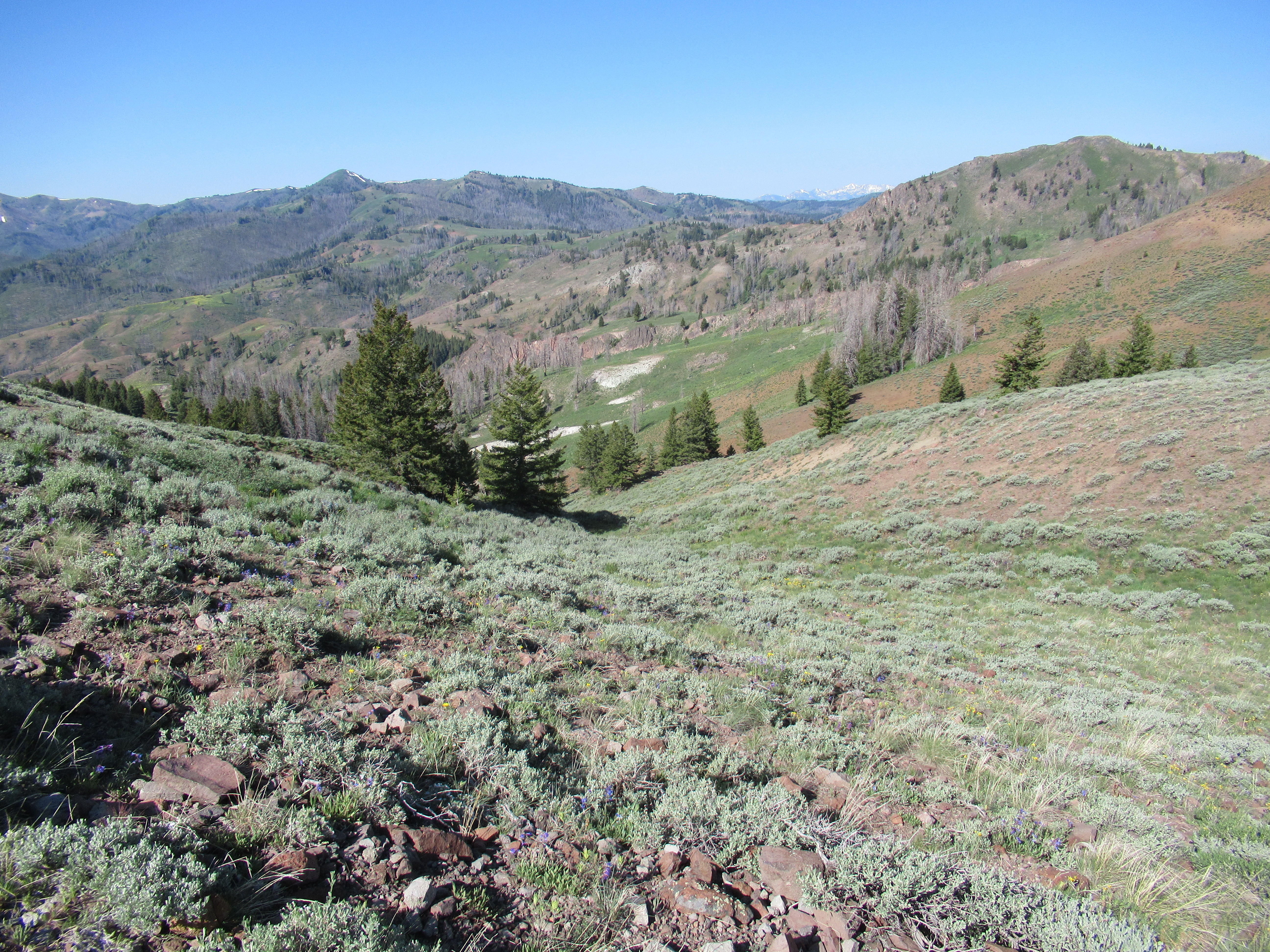 This hike is just West of Ketchum. Terrific area and very nice trails. This ended up being about 14 miles, so a long day for not having hiked around much the last months, but I'm still alive so things worked out ok. I didn't really start in the right place and started and ended with wet shoes and pants most of the way. There is a bridge you cross just before this parking lot. If you park there, you can get on the trail on the other side of the river and not get waist high wet.